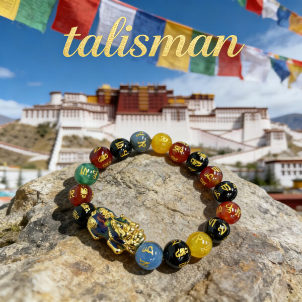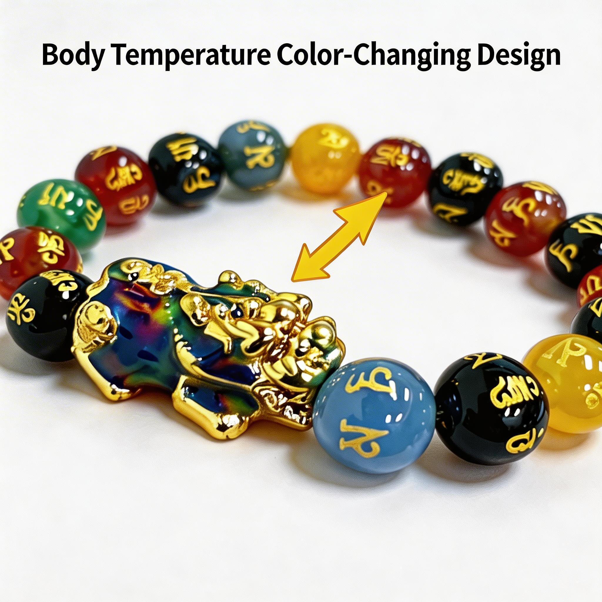 Crafted with premium multicolor agate beads engraved with the Tibetan Six Syllable Mantra, this bracelet features a thermochromic Pixiu charm that shifts colors in response to body temperature.