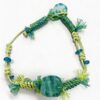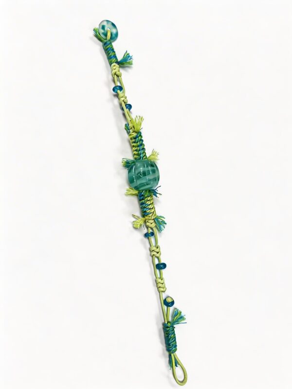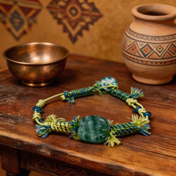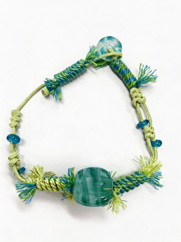 Avoid contact with harsh chemicals (perfume, lotion, chlorine) to preserve the glass’s vivid green luster and the cord’s bright colors.
