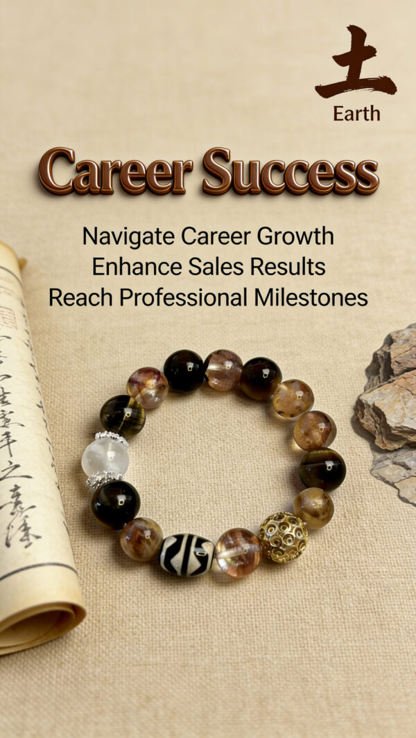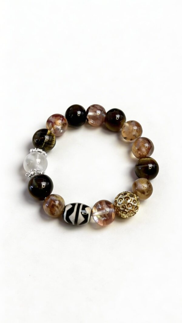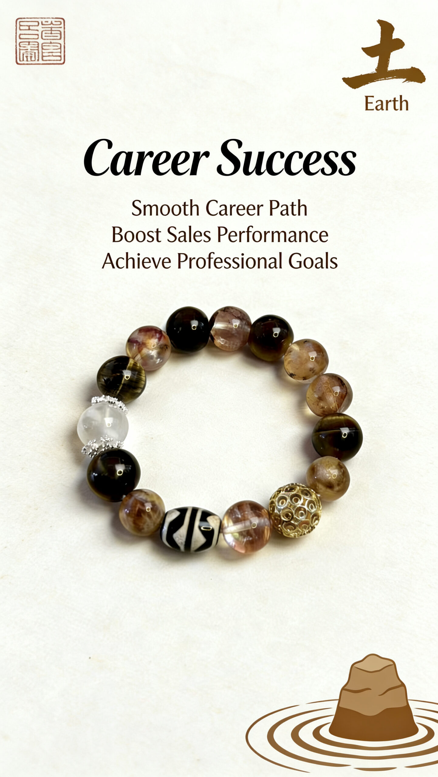 Crafted with Tiger’s Eye, Flower Agate, Clear Quartz, a gold carved bead, and a Tiger Tooth Dzi bead, each element symbolizes a different aspect of professional success—from courage and recognition to manifestation and protection.